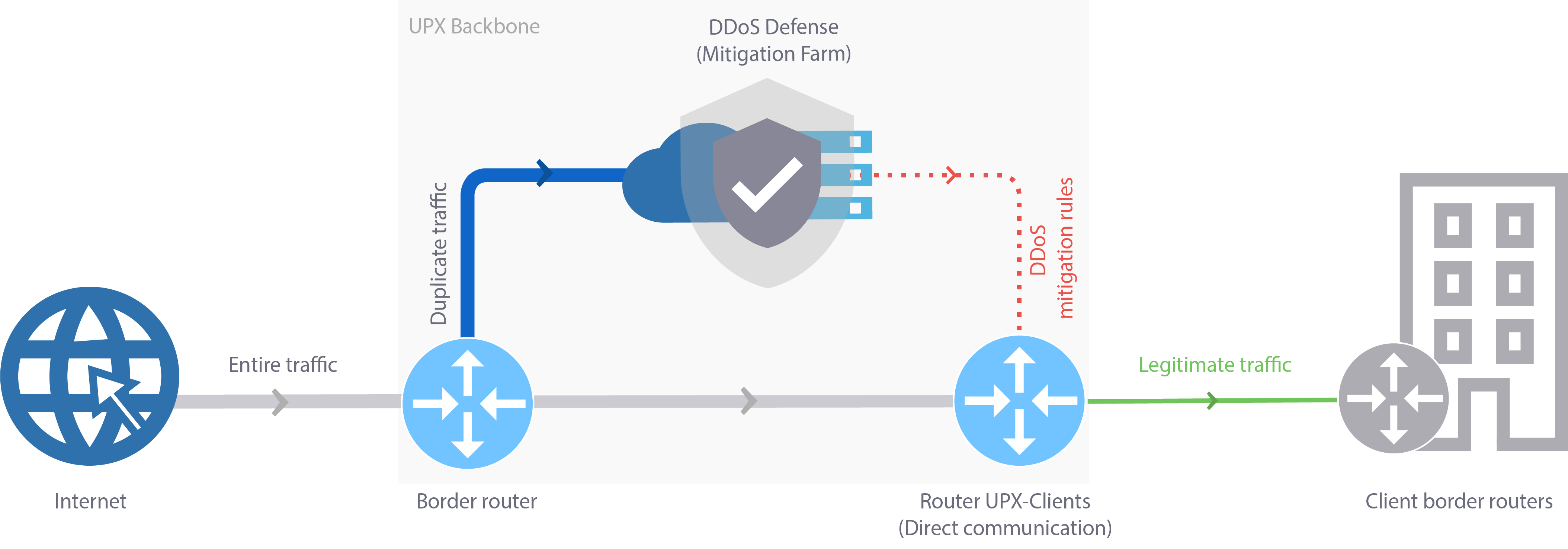 UPX mitigation detects attacks using intelligent algorithms and the inspection is made after traffic duplication by analyzing packages individually and not just a sample on the mitigation server farm, where discard rules are applied to eliminate malicious traffic and send only the legitimate one to client switches and routers.